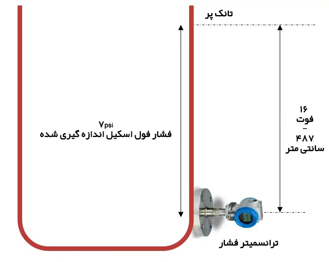 سطح یک مخزن باز باید با استفاده از یک شیر فشار در پایین مخزن اندازه گیری شود. حداکثر سطح مخزن 16 فوت (۴۸۷ سانتی متر) است. مایع موجود در مخزن دارای چگالی است که باعث می شود حداکثر سطح با فشار 7.0 psi در شیر فشار مطابقت داشته باشد (شکل زیر را ببینید).